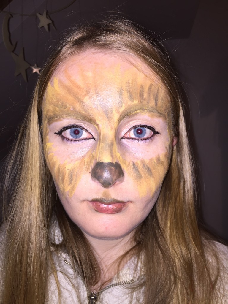 As always, I get overwhelmed as to what to dress up as for Halloween. This year I wanted to go as something different, that I hadn’t tried before. So, after many hours searching on Pinterest, I went as a werewolf. I found it quite difficult in terms of clothes, because, well what do werewolves actually wear? A werewolf has emphasis on the eyes and face, and on their character as a whole. I followed this idea, and basically used face paint, messy hair and fake blood. Well, my friend did anyway. I applied my makeup; the eyes and foundation. I opted for clothes with brown and cream colours, because of my natural colouring, if I were a wolf they would be my fur. To finish the outfit, my friend painted fake bloody scratch wounds near my collar bone.